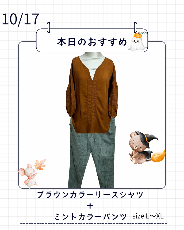 彩りSmileより ブラウンカラーリースシャツ × ミントカラーパンツ をお届けしました👗